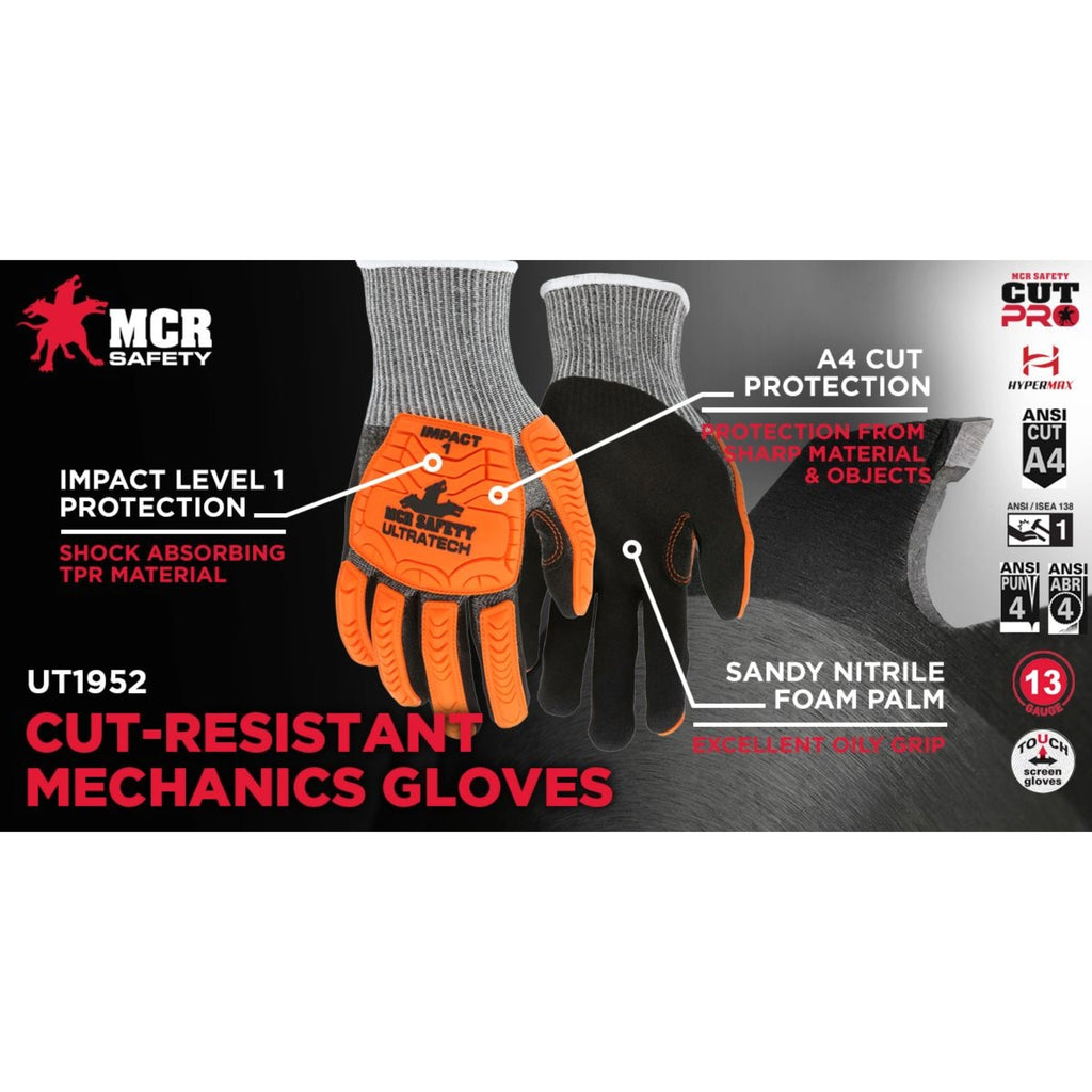 The MCR Safety UltraTech UT1952 Sandy Nitrile Foam Coated CutPro Work Gloves are designed to deliver advanced hand protection, grip, and comfort in high-risk work environments. Featuring a durable 13-gauge salt and pepper HyperMax® HPPE shell, these gloves provide dependable cut resistance along with abrasion and puncture protection. The black sandy nitrile foam palm and finger coating is engineered to absorb and bite down on surfaces, offering enhanced gripping power in dry and light-oil conditions. For added safety, the hi-visibility TPR back-of-hand protection helps shield against impacts while maintaining excellent dexterity. A reinforced thumb crotch increases durability in high-wear areas, extending glove life during demanding tasks. Common search terms such as cut-resistant impact gloves, HPPE work gloves, sandy nitrile coated gloves, hi-vis TPR gloves, and industrial cut protection gloves align with the UT1952’s performance features. Ideal for construction, manufacturing, metal handling, and material handling applications, the UltraTech UT1952 gloves provide a reliable balance of cut protection, impact resistance, and gripping control trusted by professionals across industrial job sites.