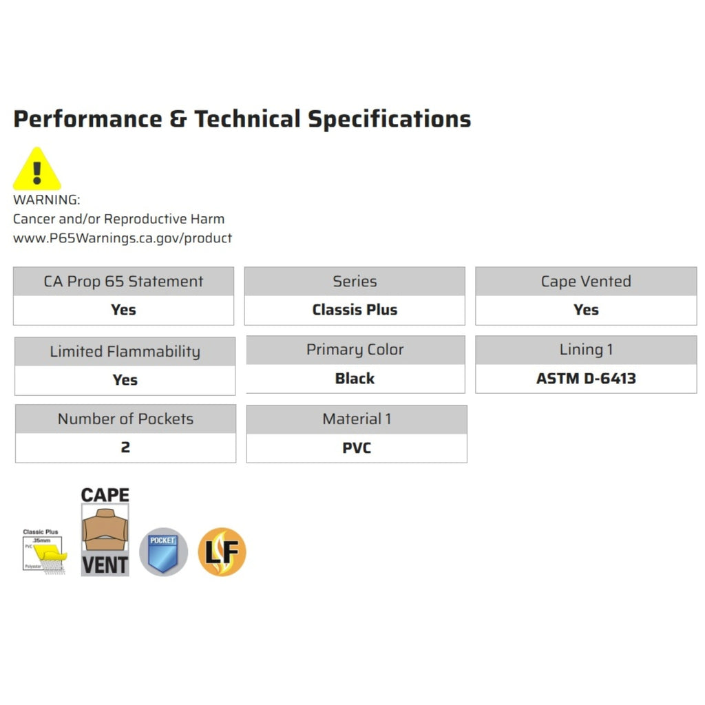 The MCR Safety Classic Plus Series FR267C Limited Flammability Waterproof Ankle Length Raincoat provides superior wet-weather protection while maintaining comfort and mobility for demanding outdoor jobs. Crafted from 35 mm PVC on polyester, this ankle-length raincoat ensures full waterproof coverage and durability. Its detachable hood and corduroy collar offer added protection and comfort, while the cape ventilated back promotes airflow to keep workers cooler during extended wear. The unique split-back design allows the coat to be snapped around each leg and worn as chaps, providing enhanced versatility for labor-intensive tasks. Equipped with a badge tab holder for easy identification, this raincoat is made with limited flammability materials, though it is not designed for ARC Flash or Flash Fire protection. Ideal for construction, utilities, maritime, agriculture, and maintenance operations, the FR267C raincoat helps workers stay dry, comfortable, and productive. Enviro Safety Products is a trusted and experienced supplier of certified PPE, delivering high-quality safety rainwear that meets stringent performance and usability standards.
