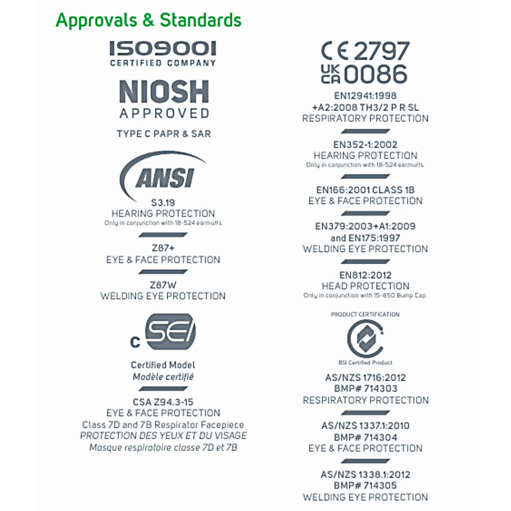 - NIOSH PAPR Type C, ANSI S3.19*, ANSI