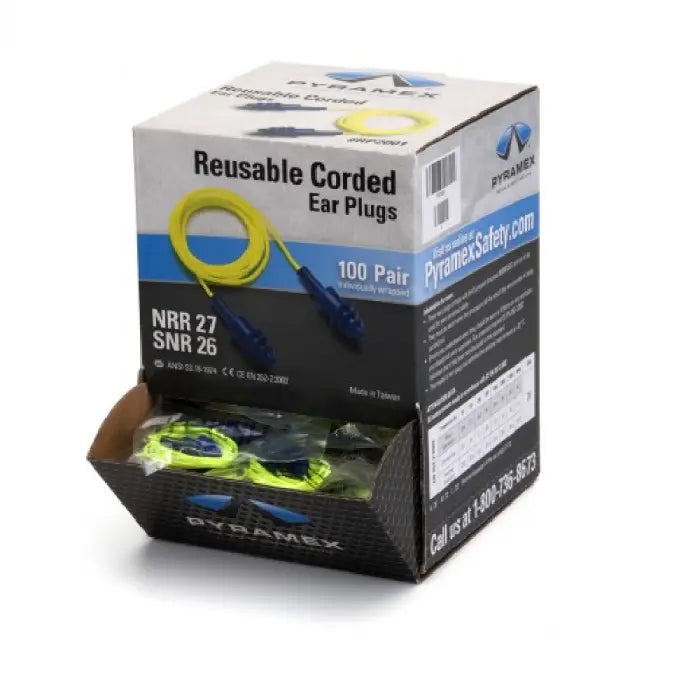 Pyramex RP2001 Reusable Corded Earplugs, Blue, One Size, Box of 100
