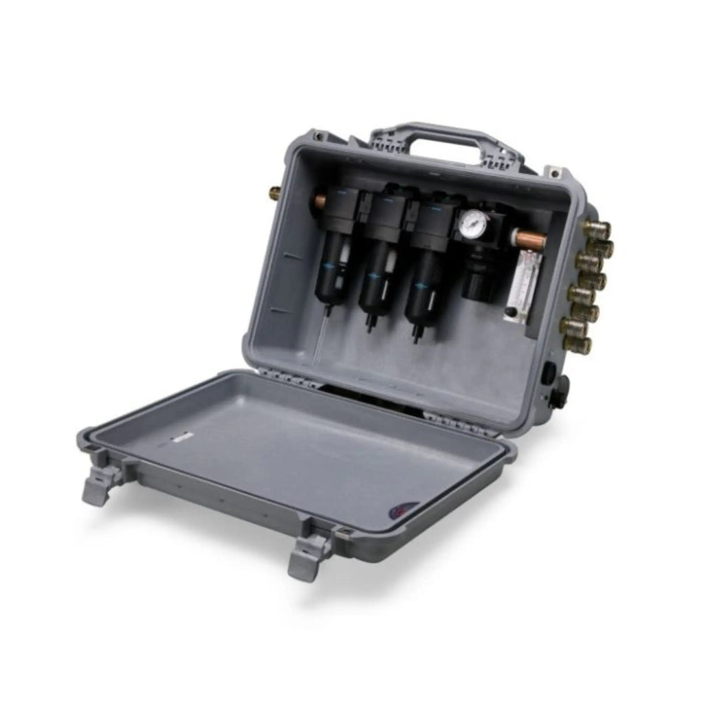 Our Carry-Air™ Filtration Panels convert shop air used for pneumatic tools and equipment to clean breathable air. They provide from 1 to 8 airline respirators a portable source of up to 15, 30, 60 or 100 CFM of breathable air from 5-125 psig. The 3-stage filtration system purifies compressed air removing water, oil and particulate contaminants. An optional carbon monoxide monitor, which can be operated in AC or DC mode, activates an audible alarm when the concentration of CO exceeds 10 ppm (set for 5 ppm in Canada). The pressure regulator includes a pressure gauge and adjustment knob with locking ring. A pressure relief valve protects the CO monitor and respirators in the event of regulator failure. The Carry-Air™ AC/DC-powered unit is housed in a rugged Pelican case for portability and protection. It includes a support stand for stability and up-right operation. An AC/DC powered Wall-Mount unit is also available. Available with and without CO monitors. All models meet NIOSH requirements for point-of-attachment. Single outlet and single inlet, 100 CFM Panel ideal for filtering air anywhere within the air line systems.