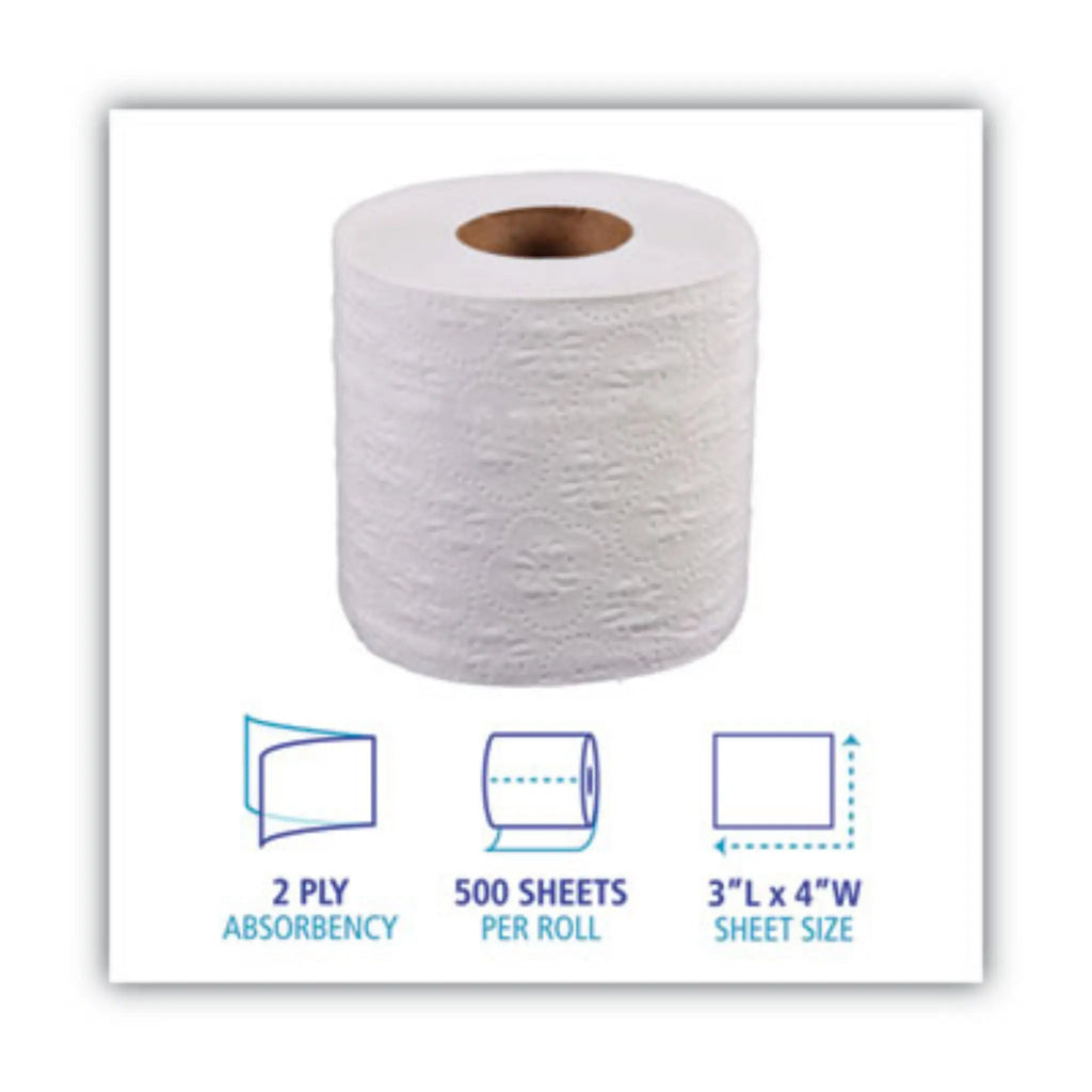 The Boardwalk 6145 2-Ply Toilet Tissue is a standard-sized and septic safe tissue, made from 100% recycled paper. These tissues are embossed and individually wrapped. Available in White, 4 x 3, Roll of 500 Sheets, Carton of 96 Rolls