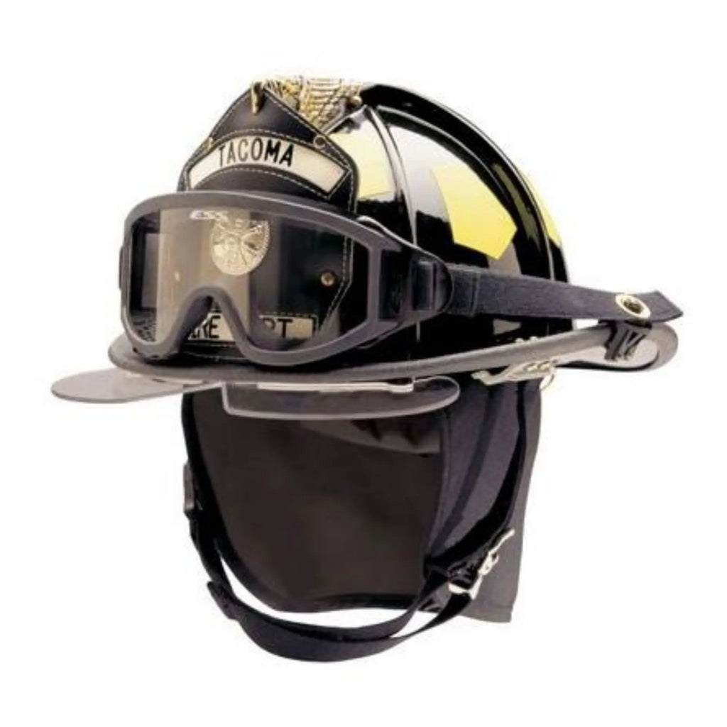 Traditional styled fiberglass structural fire helmet w/wraparound ESS IZ3 goggle, bourke eyeshield & 6" brass eagle