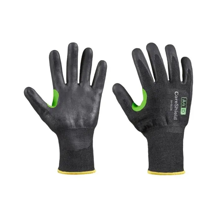 Having the right gloves for the right application is crucial to providing your workers with the optimum available protection. The Honeywell CoreShield 24-0513B Cut Resistant Gloves with 13 gauge HPPE/basalt black liner nitrile micro-foam black coating and A4/D 4X43D A4 are ideal for Manufacturing Automotive Metal stamping Glass handling Construction and Logistics.