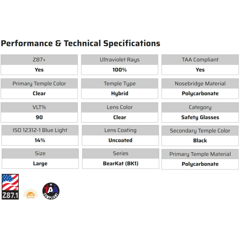The MCR Safety BearKat® BK1 Series BK010 Safety Glasses deliver a dependable combination of comfort, clarity, and certified protection for workers who need reliable everyday eye PPE. Built with a feather-light 25 gram frame and a soft, non-slip temple design, these glasses stay securely in place during long shifts, whether indoors or outdoors. The wraparound single-lens construction with integrated side shields provides a wide, unobstructed viewing area while maintaining strong impact resistance that meets ANSI/ISEA Z87.1-2020 and CAN/CSA Z94.3 standards. Buyers often ask whether these glasses offer UV protection, and the answer is yes—the durable polycarbonate lens filters 99.9% of harmful UV radiation. Customers also frequently want to know about fog resistance, and this model offers both UV-AF® and MAX6® anti-fog technologies for environments where temperature changes, humidity, or physical activity normally cause lens fogging. For users who need reading enhancement on the job, the BK010 series includes multiple diopter choices, making it useful for detailed work, inspection, or documentation tasks. As workplace safety programs evolve, the BearKat® BK1 remains a trusted, high-value option formerly known under the Crews® brand, ensuring consistent quality and compatibility for long-term PPE programs. This style is well suited for construction crews, warehouse teams, maintenance staff, and outdoor trades seeking OSHA-compliant eyewear that is lightweight yet rugged enough for fast-paced environments. Enviro Safety Products continues to serve as an experienced and trusted supplier of fully certified PPE, making it easy for safety managers to source reliable eyewear that meets modern compliance requirements while keeping workers comfortable and productive.