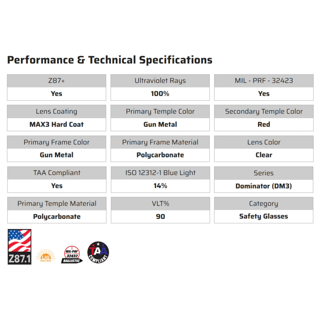The MCR Safety Dominator DM3 DM1310P Safety Glasses deliver premium protection with a sleek, Italian-inspired sport design tailored for high-performance environments. Built with a rugged gun metal frame and a clear polycarbonate lens featuring MAX3® hard coating, these glasses offer enhanced scratch resistance and long-lasting clarity. The DM3 Series meets ANSI/ISEA Z87.1-2020 high-impact standards, passes the ANSI anti-fog test, and exceeds MIL-PRF-32432 ballistic requirements—making it suitable for military, tactical, and industrial use. Co-injected wire-core adjustable nose pads and temples allow a personalized, secure fit while TPR temples ensure superior grip and comfort during extended wear. Multiple lens coating options and diopter strengths support diverse applications, and each pair includes a microfiber cleaning and storage bag for convenience. TAA compliant and engineered for demanding conditions, the DM3 DM1310P offers exceptional style, durability, and performance for professionals who require dependable eye protection.