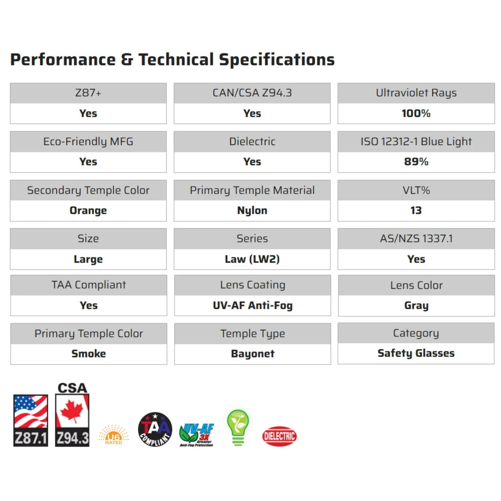The MCR Safety Law LW2 Series LW212AF Safety Glasses provide exceptional lightweight protection with advanced anti-fog performance for demanding job environments. Featuring UV-AF® anti-fog lens technology, these dielectric safety glasses maintain clear vision in humid, hot, or fast-paced working conditions. The single-lens design includes integrated side shields to maximize orbital protection, while the TPR-enhanced nose pads and temple inserts ensure a secure, slip-resistant fit all day long. Constructed with a durable polycarbonate lens that blocks 99.9% of harmful UV rays, the LW212AF offers reliable eye protection without added weight. A hybrid temple design enhances comfort and stability, and the metal-free dielectric build makes these glasses safe for electrical applications. Fully compliant with ANSI/ISEA Z87.1 2020 standards, this eyewear is ideal for construction, utilities, manufacturing, and general industrial use. Available now at Enviro Safety Products for workers who need lightweight, anti-fog eyewear built for performance and comfort.