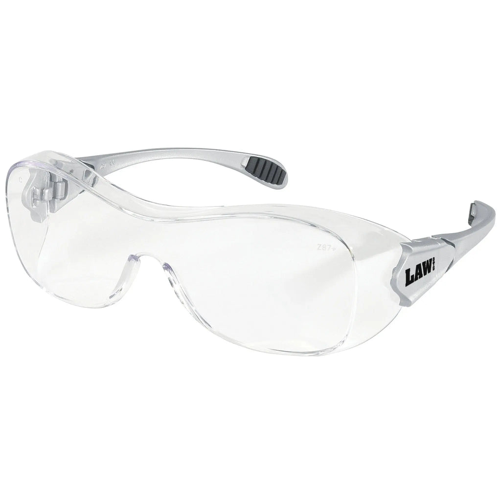 The MCR Safety Law OTG OG110AF Anti-Fog Over-the-Glass Safety Glasses are built to deliver superior eye protection for users who wear prescription eyewear. Designed with an oversized frame and lens, they comfortably fit over most glasses without causing pressure or discomfort. The dielectric construction containing no metal pieces makes them safe for electrical environments, while the 5-position ratchet temples allow users to adjust the lens angle for a customized and secure fit. Built with a durable polycarbonate lens that blocks 99.9% of harmful UV rays, these OTG glasses ensure reliable impact protection and visibility. The Duramass® scratch-resistant and anti-fog coating enhances clarity in humid or high-temperature environments, making them ideal for construction workers, industrial technicians, laboratory personnel, and anyone needing dependable OTG eye protection. Trusted by safety professionals and formerly part of the Crews® Safety Glasses line, this model delivers long-lasting performance for a wide range of work environments.