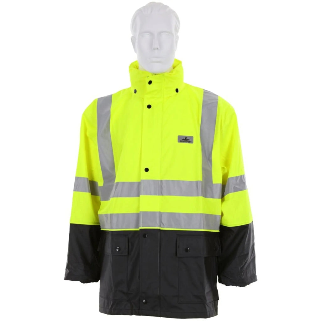The MCR Safety Luminator Series 5182S Hi-Vis Reflective Rain Suit delivers superior protection, comfort, and visibility for professionals who work in wet or low-light environments. Engineered with a .40mm polyurethane coating over a cotton-poly stretch fabric, this Type R Class 3 ANSI/ISEA 107-2020 compliant rain suit offers exceptional waterproofing while maintaining flexibility and breathability. The stretch fabric moves with your body, ensuring a comfortable, unrestricted fit that supports productivity during long shifts in unpredictable weather. Featuring silver reflective striping for 360° visibility and a high-visibility lime color, the 5182S enhances worker safety around vehicles and machinery. The jacket’s attached drawstring hood provides adjustable protection, while the cape-vented back promotes airflow and reduces moisture buildup. Elastic waist pants ensure a secure, ergonomic fit, making the suit ideal for year-round use in construction, utilities, transportation, and municipal work. Buyers often ask if this rain suit is insulated—it’s not, allowing layering for all-season adaptability—and if it meets current compliance standards—yes, it’s certified to ANSI/ISEA 107-2020, ensuring full visibility compliance. Designed for professionals who demand both mobility and protection, the MCR Safety Luminator 5182S stands out as a dependable solution for tough outdoor conditions. Available from Enviro Safety Products, a trusted and experienced supplier of certified PPE and high-visibility rainwear solutions serving industrial and municipal teams across North America.
