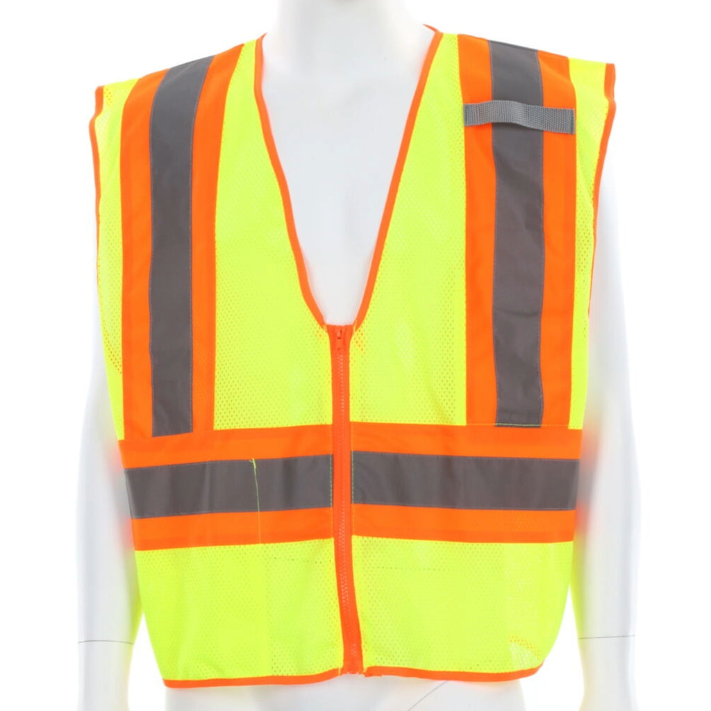 - Class 2 hi-visibility mesh safety vest with zipper front closure