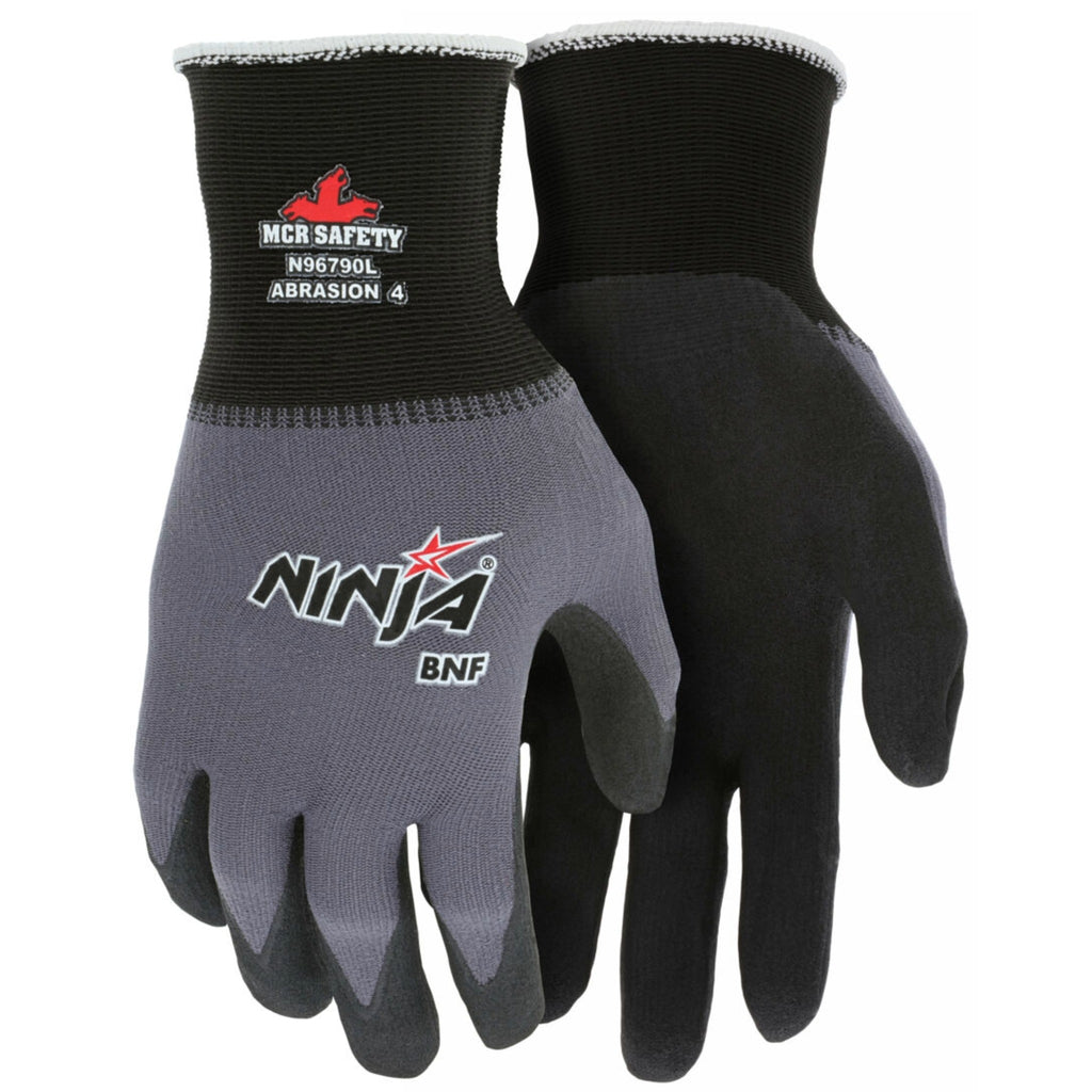 The MCR Safety Ninja VPN96790 BNF Breathable Nitrile Foam Work Gloves are engineered for superior performance, comfort, and durability in demanding work environments. Built with a 15-gauge nylon/spandex shell, these gloves offer exceptional flexibility and a snug, ergonomic fit that minimizes hand fatigue during extended use. The advanced BNF coating with NFT® technology delivers excellent wet or dry grip and provides up to 47% greater abrasion protection compared to leading competitors. Workers looking for gloves that combine strength, dexterity, and breathability will appreciate the Ninja VPN96790, making it an ideal choice for assembly, material handling, automotive, and maintenance applications. Available in vending packaging, these gloves are a reliable PPE solution trusted by professionals across multiple industries.