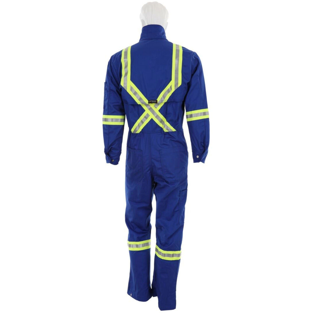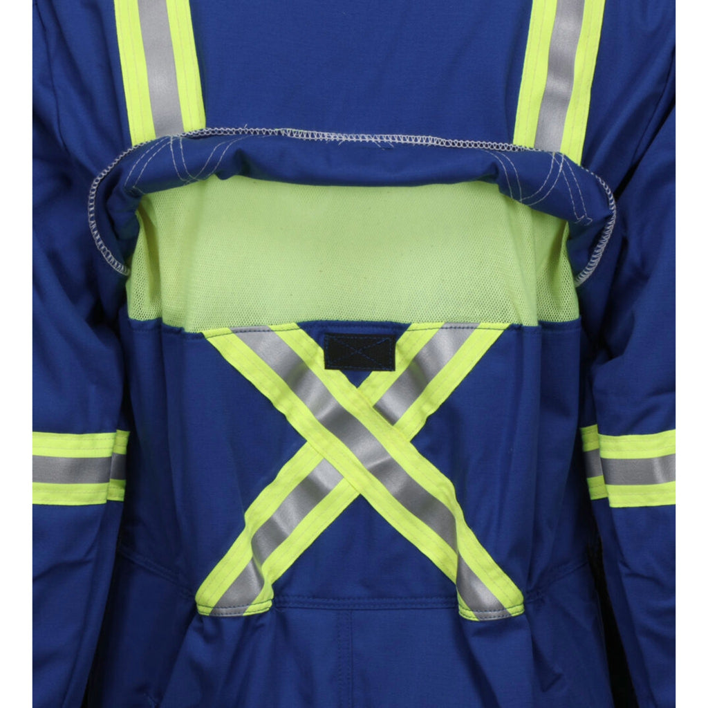 - 3-inch FR yellow/silver/yellow triple trim reflective stripes on arms and legs