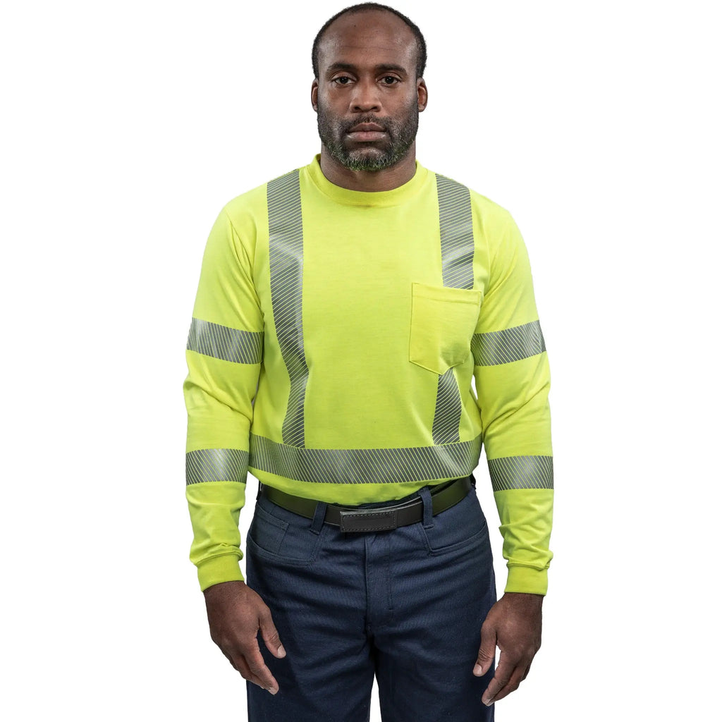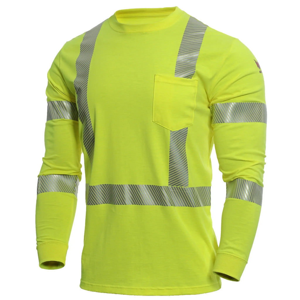 The National Safety Apparel DRIFIRE DF2-AX3-793LSP-HY Strongknit FR Long Sleeve Hi-Vis T-Shirt, Class 3, Fluorescent Yellow, is designed to provide superior visibility, comfort, and flame-resistant protection for workers in high-risk environments. Built with DRIFIRE’s advanced Strongknit fabric, this high-performance safety shirt combines lightweight breathability with durable FR properties, ensuring compliance without sacrificing comfort during long shifts. The Class 3 rating delivers maximum visibility in low-light and high-traffic conditions, while the fluorescent yellow color enhances worker safety on job sites. Engineered with moisture-wicking technology to keep wearers cool and dry, this FR long sleeve shirt is an ideal choice for construction, utility, and industrial professionals who demand reliable protection. Its exceptional balance of safety, compliance, and comfort makes it a trusted choice for those who need dependable performance in environments where both fire resistance and visibility are critical.