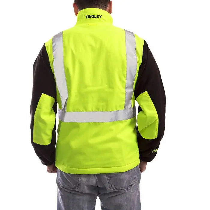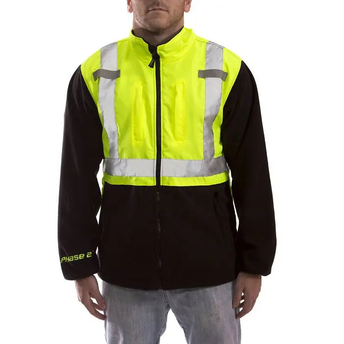 Phase 2 - Fleece Jacket - breathable, insulating, wind resistant, high visibility outerwear. An innovative jacket constructed from a combination of 150 denier fluorescent yellow-green polyester and 360g black fleece that keeps you warm and visible, yet cool and comfortable for 3 season protection. Applications: For use in environments where high visibility and warmth are desired for wearer safety and comfort.
