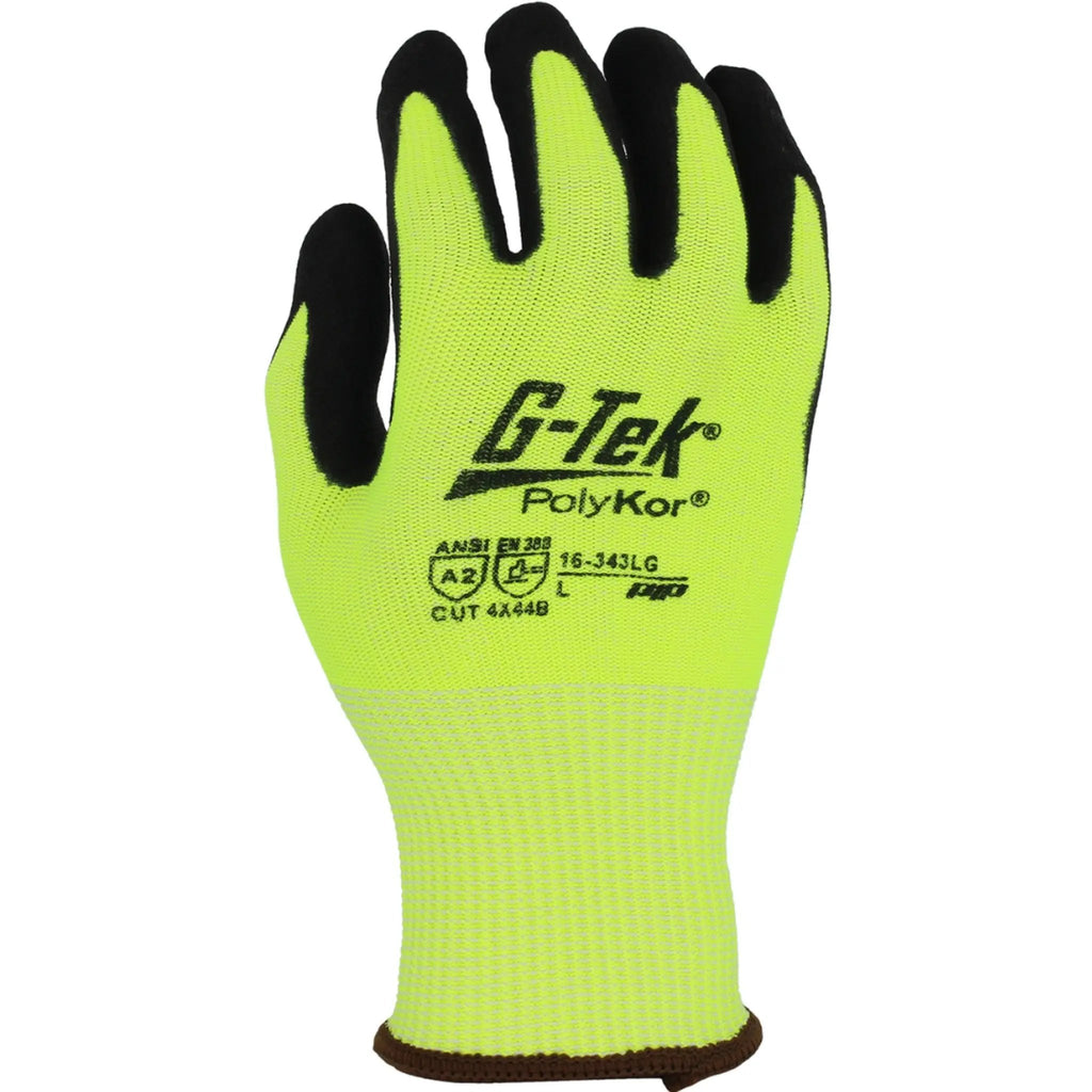 The PIP G-Tek PolyKor 16-343LG Hi-Vis Seamless Knit PolyKor Nitrile Coated Grip Glove, Hi-Vis Yellow, 1 Dozen, delivers premium hand protection, superior comfort, and enhanced visibility for today’s demanding work environments. Built with PIP’s advanced PolyKor fiber blend, these seamless knit gloves provide ANSI A2 cut resistance while maintaining exceptional flexibility and breathability for all-day wear. The nitrile-coated palm and fingers offer a firm, slip-resistant grip across dry, wet, and oily surfaces, making them ideal for automotive, construction, and manufacturing applications where precision and control are essential. The hi-vis yellow color ensures high visibility on busy job sites, helping workers stay compliant with safety standards and easily identifiable in low-light conditions. Many users ask if these gloves perform well outdoors or in wet conditions—the answer is yes; the nitrile coating repels moisture while maintaining flexibility and durability even in challenging environments. Compared to standard work gloves, the 16-343LG offers superior abrasion resistance, comfort, and longevity, making them a cost-effective solution for teams needing reliable PPE. Perfect for technicians, mechanics, and warehouse staff, these gloves balance safety and dexterity for a range of industrial applications. Backed by Enviro Safety Products, a trusted and experienced supplier of certified PPE, professionals can depend on verified product quality, consistent performance, and expert customer support when choosing the PIP G-Tek PolyKor 16-343LG for workplace safety.