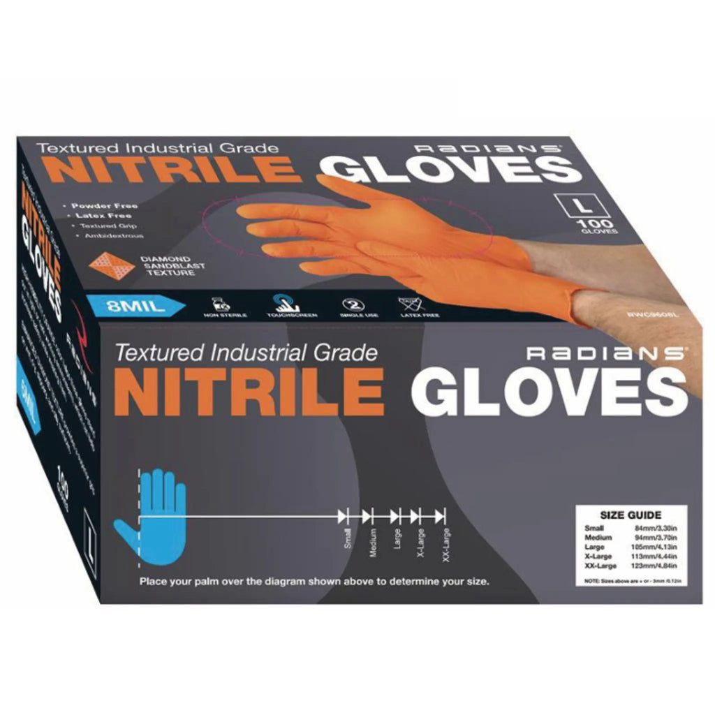 The Radians RWG9608 8 Mil Nitrile Diamond Grip Disposable Industrial Grade Glove in bright orange is designed for workers who demand reliable hand protection in tough conditions. With a thick 8 mil nitrile construction and a raised diamond grip, these gloves deliver superior control even in wet, oily, or cold weather environments where lesser gloves often fail. Buyers often ask if these gloves are chemical resistant—yes, they provide reliable resistance against many industrial solvents, oils, and greases, making them an excellent alternative to traditional latex gloves while eliminating allergy concerns. They are also disposable and powder-free, ensuring a clean fit for sensitive tasks while still offering durability that rivals reusable insulated grip gloves. Workers in construction, automotive repair, and manufacturing frequently choose this glove for its comfort, high visibility, and extended cuff that helps protect the wrist. If you are looking for winter PPE that balances dexterity with protection, these gloves remain flexible in lower temperatures and are built to hold up through demanding jobs. Customers also want to know if they can be used for both heavy-duty and precision work—the answer is yes; their textured diamond surface provides secure handling for tools, parts, and even delicate equipment. As an experienced and trusted supplier of certified PPE, Enviro Safety Products provides these Radians RWG9608 gloves in convenient cases of 10 boxes, ensuring businesses and workers always have access to professional-grade hand protection that meets safety compliance and productivity needs.