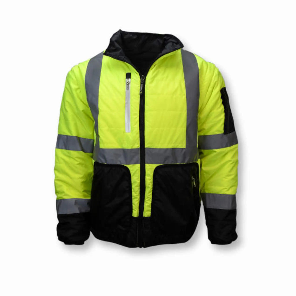 The Radians SJ510 Quilted Reversible Jacket with Zip-Off Sleeves is an all-purpose, 4-in-1, quilted polyfil ripstop jacket provides superior, cross-seasonal comfort and weather protection. Reverses from dark, low-profile grey to bright, hi-vis yellow. The zippered sleeves allow the Class 3 hi-vis jacket with sleeves to easily convert to a Class 2 hi-vis vest without sleeves.
