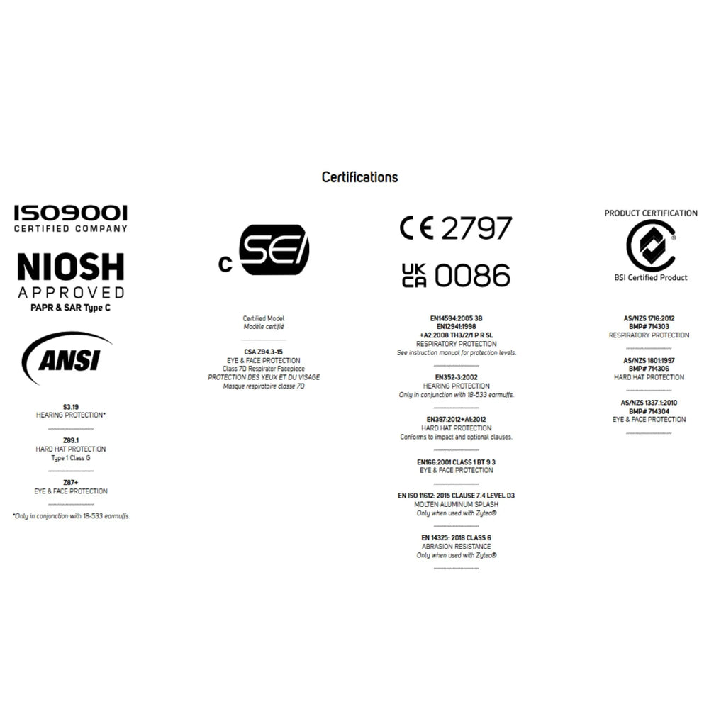 - ANSI Z89.1, ANSI Z87+, ANSI Z87W†, c SEI CSA Z94.3-15