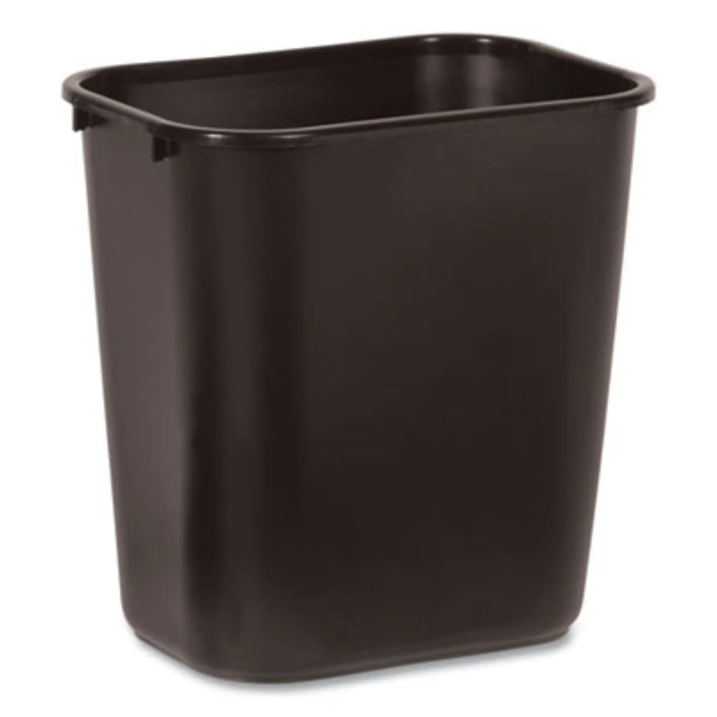 The Rubbermaid Commercial Prod. RCP295600BK Deskside All-Purpose Wastebasket is a black plastic rectangular prism with an open top, designed for office waste disposal and is compatible with the Rubbermaid Rectangular Free-Swinging Lids.