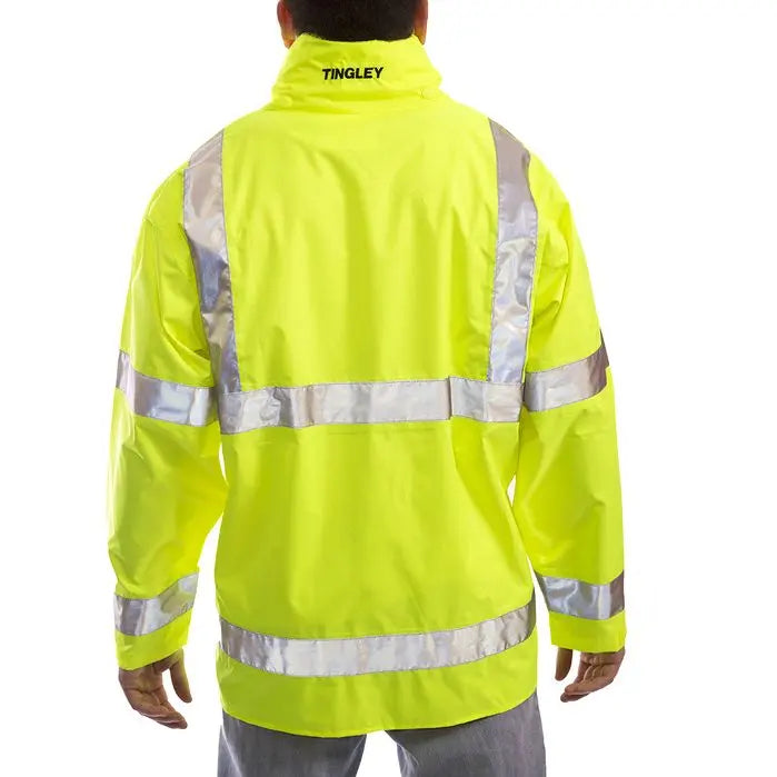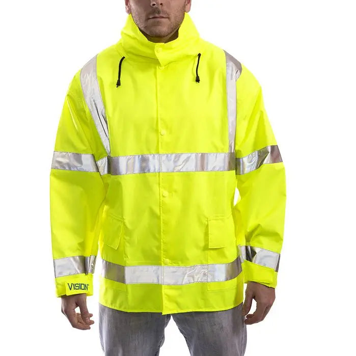 Tingley's Vision rain jacket has stitched and taped sealed seams for 100% waterproof protection. Features easy access cargo pockets with Velcro closure, roll-a-way hood in collar design, and storm fly front seals to keep out wind and rain. Sleeves have Velcro take-up straps for an adjustable fit. Jacket is mildew resistant. Breathable material allows moisture vapor and heat to escape, keeping you cool and dry.